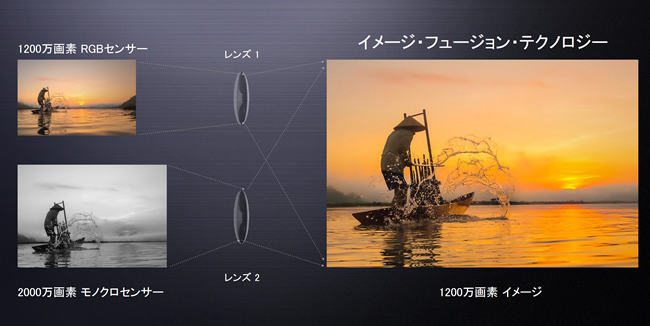 カラーとモノクロの二つのセンサを組み合わせた独自の仕組み