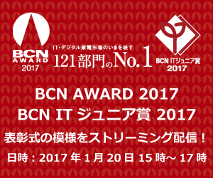 第18回目を数える今回は、ハードウェア部門88部門、ソフトウェア部門33部門の121部門・58社が受賞。また1月20日には、東京・品川の「TKPガーデンシティ品川 ボールルームイースト」で、「BCN AWARD」の受賞企業や販売店などの関係者、同時に発表した「BCN ITジュニア賞 2017」の受賞者・受賞団体、その指導にあたった先生方などを招き、表彰式を開催します。