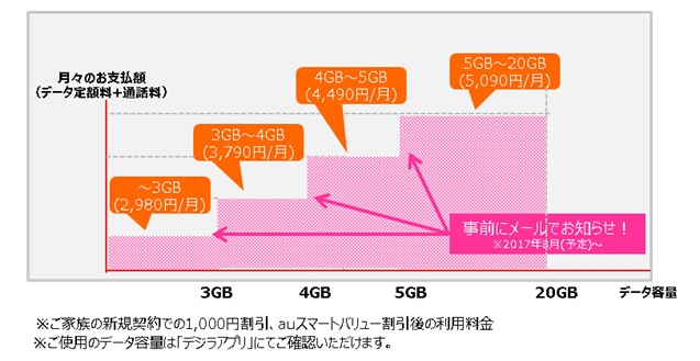 「U18データ定額20」の税別の月額料金は3390円で、5~20GBの場合は5590円。「スーパーカケホ」やインターネット接続料をあわせ、「auスマートバリュー」割引適用後の料金は3980円から。受付期間中に家族が「au」を新規契約した場合は、18歳以下のユーザーの月額料金をさらに1000円割り引く。