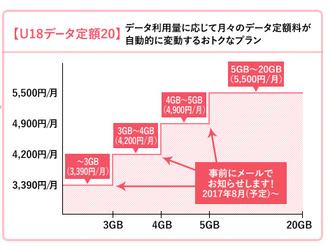 5GBまでは変動、5GB~20GBは割安なデータ定額プラン「学割天国U18」