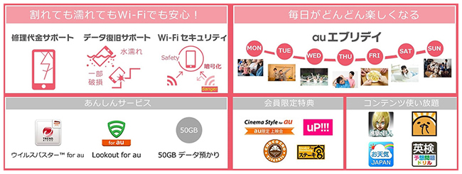 ほかにも、端末の破損・水没時に画像や電話帳などのデータを取り出す「データ復旧サポート」、セキュリティの不十分な公衆無線LANサービス利用時に通信を保護する「Wi-Fiセキュリティ」を追加。また、「auのほけん特典」として、最大100万円の個人賠償責任補償、5万円の入院一時金保険をプレゼントする。補償期間は申し込み後、3か月間。