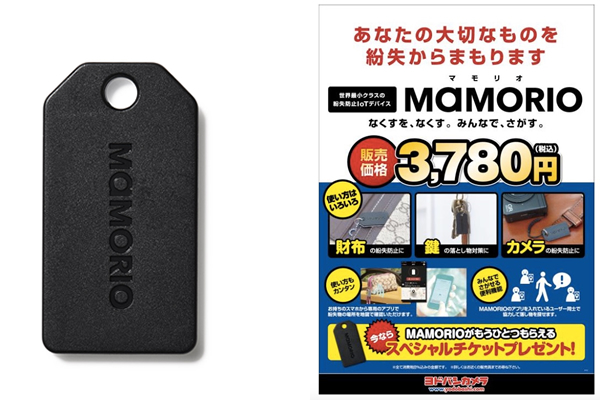MAMORIOは、世界最小クラスの紛失防止IoTデバイス「MAMORIO」を、ワイヤレスゲートを通じて全国のヨドバシカメラ店舗、オンラインショップの「ヨドバシ・ドット・コム」で発売した。税込価格は3780円。