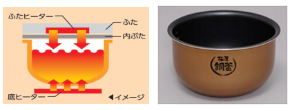炊きむらの少ない炊飯が可能な底+蓋ヒーターの仕組み(左)と、厚さ3mmの極厚銅釜