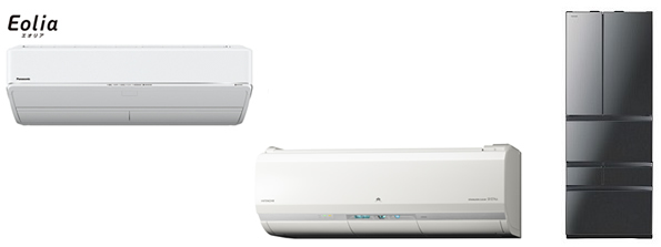 「省エネ大賞」を受賞した各社のエアコン(左から、パナソニックのWXシリーズ、