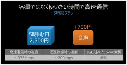 従来の容量ではなく、時間帯で通信速度が変わり、1日あたり計5時間まで下り375Mbps/上り50Mbpsの高速通信が使い放題できる新プラン「5時間プラン」を追加した。高速通信時間終了後の通信速度は下り/上りとも200Kbps。税別の月額料金は、データSIMの場合で2500円。システム側で高速通信を必要とする通信量を自動検知。高速通信時間の消費が無駄なく抑えられるという。利用者による設定は必要なく、必要な時だけ高速通信が利用できる。