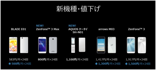 サービス強化にあわせ、取り扱い端末に、スマートフォンの「ZenFone 3 Max」と折りたたみ式携帯電話の「AQUOS ケータイ SH-N01」を追加し、販売中の3機種「ZenFone 3」「arrows M03」「BLADE E01」の価格を値下げした。また、これまではSIMカードとセットの同時購入だけだったが、SIM購入後に、端末だけ追加購入できるようにする。