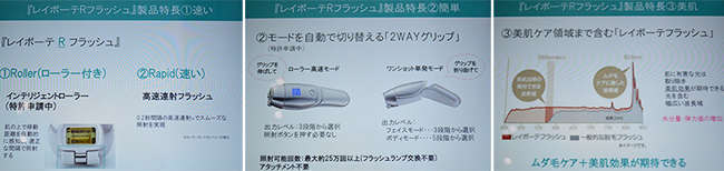 「レイボーテ R フラッシュ」は、エステサロンで使用される業務用光美容器にヒントを得て、肌の上で移動距離を感知しながら転がる独自開発の「インテリジェントローラー」を搭載。最短0.2秒間隔で、従来の「レイボーテ」シリーズ同様、独自開発の光「レイボーテフラッシュ」を広範囲にすばやく照射してムダ毛を目立たなくする。