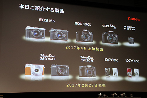 新製品のラインアップは、デジタル一眼レフカメラの「EOS 9000D」と「EOS Kiss X9i」(それぞれ「EOS 8000D」「EOS Kiss X8i」の後継機)、デジタルミラーレスカメラの「EOS M6」(「EOS M3」の後継機)、コンパクトデジタルカメラ「PowerShot G9 X Mark II」(「PowerShot G9 X」の後継機)となっている。