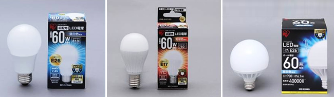 5年保証の対象となるLED電球(左から、A形口金-E17、E26、G形)