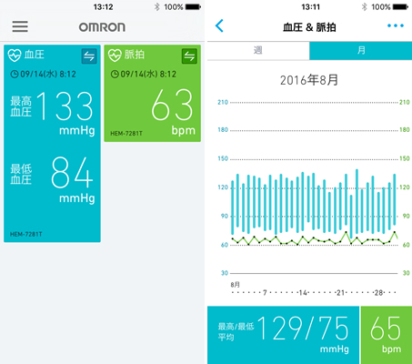 本体にはBluetooth機能を搭載し、iPhone/Android向けの専用アプリ「オムロン コネクト」に測定データを転送して、血圧値の推移を確認・管理できる。「オムロン コネクト」は、他社の健康管理アプリとのデータ連携に対応しており、測定データを、Appleの「ヘルスケア」など、他社アプリで確認・管理することもできる。