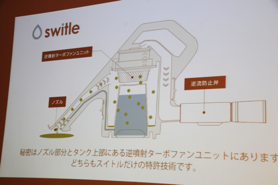 スイトルは、川本技術研究所の川本栄一代表が20年以上にわたり研究・開発を行ってきた水洗い掃除機の新機構「アクアサイクロン技術」を搭載。外気を取り込みながら、ノズル先端に水を噴射して、水と一緒に汚れを吸い取る。