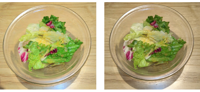 食べ物をより鮮明にする「ナイスフード」で撮影したサラダの写真(左)。