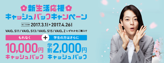 VAIO、学生なら2000円プラス、新生活応援キャッシュバックキャンペーン