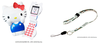 「ハローキティンフォン」(左)と、キャンペーン特典としてプレゼントする特製オリジナルネックストラップ