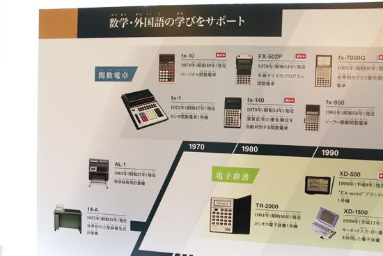 1950年代から、ルートや三角関数の計算ができる化学技術用計算機を開発してきたカシオ計算機。現在では、数学や外国語など「学び」に役立つツールにも派生している。記念館では、LLカセットレコーダーなどのアナログ時代から、現在に至るまでの歴史を遡ることができる。