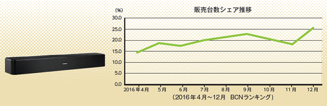 3万円台と手頃な価格のボーズのテレビ用スピーカー「Solo 5 TV sound system」が売れている。全国の主要家電量販店・ネットショップの実売データを集計する「BCNランキング」によると、16年4月の発売以来、月間販売台数1位をキープ。しかも、シェアは右肩上がりで伸び、16年12月には約25%と、ホームシアターシステム全体のほぼ4分の1を占めた。