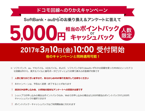 auまたはauの回線を使ったMVNO、ソフトバンク、ワイモバイル、ソフトバンク回線を使ったMVNOなど、NTTドコモ回線以外から「楽天モバイル」の通話SIMにMNPで乗り換え、簡単なアンケートに回答したユーザーを対象に、先着で「楽天スーパーポイント」5000ポイントプレゼント、または5000円キャッシュバックする。