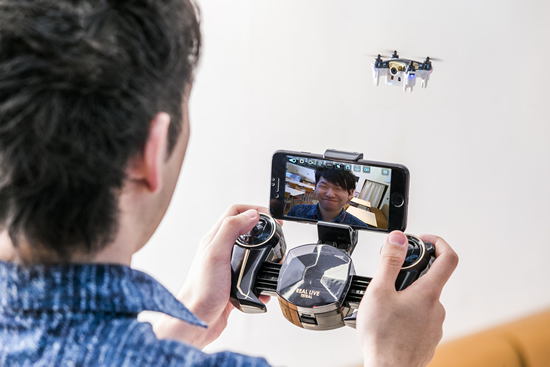 本体にカメラを搭載し、スマホをセットできるコントローラーで離陸・着陸・上昇・下降・ホバリング・宙返りなど12のアクションを楽しみながら、空中で動画や静止画を撮影できる。気圧センサーで自動で高度調整を行うため、飛行の安定度が高く、初心者でも簡単に操縦できる。