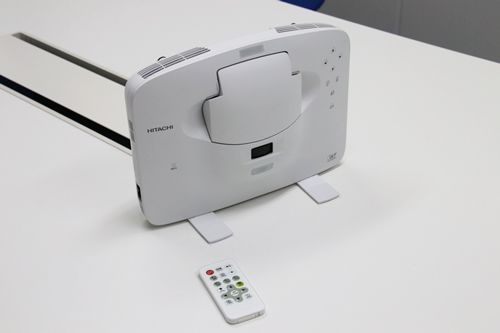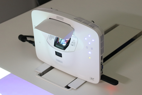 投写距離はボールペンが一本入る程度の超短投写で、スクリーンの大きさは36型と大きめ。会議室や応接用の机といった限られたスペースで使用できるので、プレゼンテーション、接客応対など、用途の幅は広い。