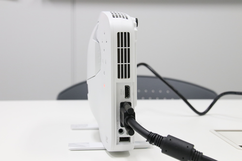 セッティング方法は電源ケーブルと、映像入力だけ。HDMIやUSBなど、豊富な接続端子も備える。特徴的なのは、USBメモリから直接画像を表示できる機能。PCを使わずにプレゼンテーションができるので、ノートPCなどを持ち運び、接続する手間がかからない。