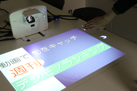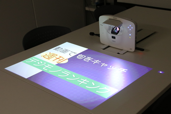日立マクセルのプロジェクター「SP-1J」は、机に画面を投写するタイプ。明るい室内でも映りに問題はなく、視線を少し下げるだけで資料が確認できる。何より、プロジェクターで投影しながらでも、向かい合ったまま会議を続けられる点が魅力だ。