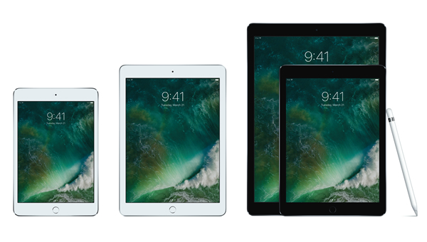 iPadファミリー(左から、iPad mini 4、iPad、iPad Pro)