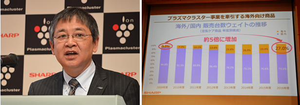 シャープのプラズマクラスター搭載製品は、2017年2月末に世界累計販売台数7000万台を突破した。独自の空気浄化技術として搭載製品を増やし、現在は15カテゴリで展開する。健康・環境システム事業本部 副事業本部長 兼 空調・PCI事業部長の中島光雄氏によると、海外の販売比率が伸びており、2009年度と16年度を比較すると、約5倍に増加しているという。