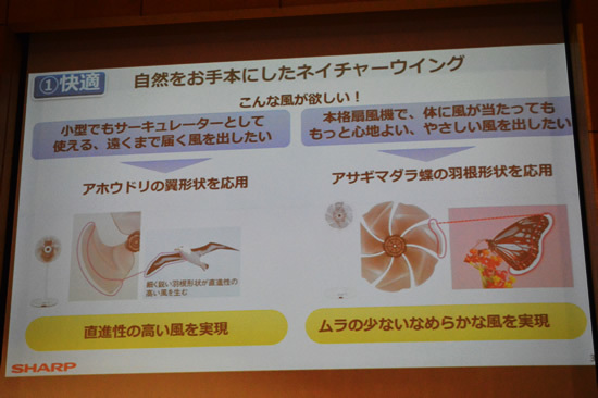 同時に発表した扇風機は、鳥や虫の羽を参考に自然風を生み出す「ネイチャーウイング」を採用。3Dファンの「PJ-G2DBG」は、細く鋭い形状の“アホウドリ”と付け根は丸く先端は尖った“アマツバメ”の羽を模した。直進性の高い風を実現し、「サーキュレーターとしても活用したい」という要望を叶えるためだ。従来機種に比べ、風量は約50%向上した。一方、「PJ-G3DG」は“アサギマダラ蝶”と“アゲハチョウ”の羽のくびれやうねりを参考に、ムラの少ないなめらかな風を生み出すように設計。こちらは扇風機の風を長時間受けても“だるさ”を感じさせないという意図がある。「PJ-G3DS」でも、「アサギマダラ蝶」の羽根形状を応用した「ネイチャーウイング」を採用し、同様にだるさ感を抑えた。