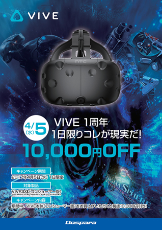 4月5日限定で、HTC VIVEのユーザーに、Vive StudioによるVRアクションゲーム「アーケードサガ」を無料でダウンロード提供する。また、VIVEオフィシャルストアと、正規販売店のオンラインショップ・実店舗で「HTC VIVE」本体を購入すると、通常より1万円割り引く。VIVEオフィシャルストアでの通常販売価格は、税込で10万7784円。