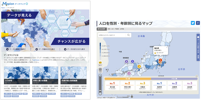 マピオンは、国勢調査などのオープンデータを誰でも簡単に参照・活用できる無料サイト「マピオンデータマップ」を3月27日に公開した。
