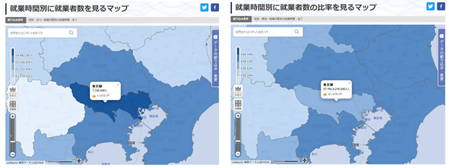 3月27日現在、提供しているのは、「人口マップ」「世帯数マップ」「交通手段マップ」「起業者マップ」「就業時間マップ」と、「対象人口÷総人口」など総数による割合が見られる5種類の「比率マップ」をあわせた計10種類。
