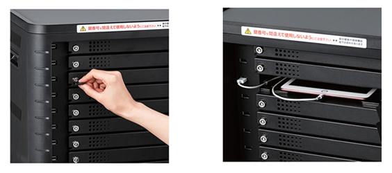 1段につき1台ずつ端末を収納でき、それぞれ個別に扉の開閉・施錠ができる。各段には、2.4A対応の充電用USBポートを装備。保管した状態でまとめて充電でき、さらにiPadは、充電しながらデータを同期できる。