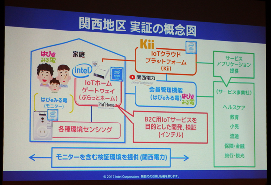 実験は2017年4月から18年3月にかけて実施。関西電力の家庭向けサービス「はぴeみる電」に加入する関西地区のファミリー世帯100戸に、ぷらっとホーム社製のIoTホームゲートウェイと環境センサを設置する。IoTホームゲートウェイにはインテルAtomプロセッサが、環境センサにはインテルQuarkプロセッサが搭載されている。