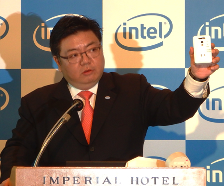環境センサをかざすインテル執行役員 インダストリー事業本部