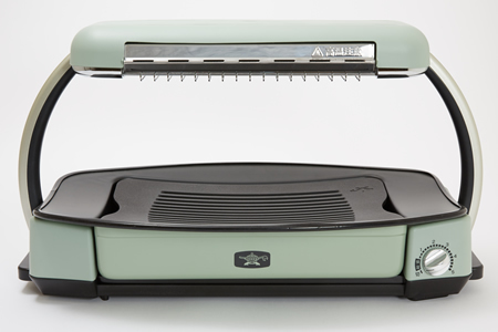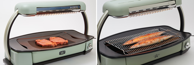 食材に合わせて自在に火力の調整ができ、熱源を上部に、焼き網の下に水トレイを配置した独自の構造なので、付属の「ヘルシーネット」を使うと「煙」や「ニオイ」を気にせず、余分な「油」を落としてカロリーカットできる。市販のスキレットなどを使うことで、焼き物以外のメニューも可能。より早くジューシーな焼き・炙り料理ができる「クイックプレート」も付属する。カラーは、アラジングリーン。