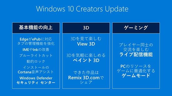 「Creators Update」は、人々の創造力の刺激や人々の創造力を広げることを目指して設計し、基本機能の向上に加え、誰でも3D制作やゲーム配信などができる新機能を追加した。3Dや複合現実といった没入型のエクスペリエンスも提供し、ASUS、Dell、HP、Lenovoの各社は、Creators Updateのリリースを受けて「Windows Mixed Reality」対応ヘッドセットを発売する予定。