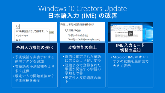 変換性能については、直前に確定された単語に応じて、より賢い変換を可能にしたほか、「短縮よみ」で登録された単語が関係する学習の挙動の改善、安定性の向上などを行った。また、Microsoft IMEのオン/オフ状態を、全面で大きく表示するように変更した