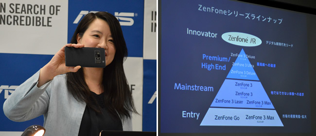 「ZenFoneの革命児」と銘打った「ZenFone AR」を掲げたASUS JAPANマーケティング部のシンシア・テン部長は、「シリーズ最高峰のモンスターマシン」と紹介した。これまでエントリー・ミドルクラス・ハイエンドの三つのセグメントにラインアップを区分していた「ZenFone」シリーズだが、「ZenFone AR」はさらにその上の「イノベイター」のクラスに位置づける。