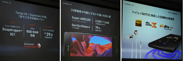 こうした先進的機能を支えるのは、「ZenFone」史上最高となる2K(2560×1440ドット)の高解像度ディスプレイをはじめ、従来のスマホの枠を大きく超えたスペック。今回、世界で初めて8GBのメモリを搭載。CPUはクアッドコアのSnapdragon 821(2.35GHz)で、デスクトップPC並のグラフィック性能を発揮する。