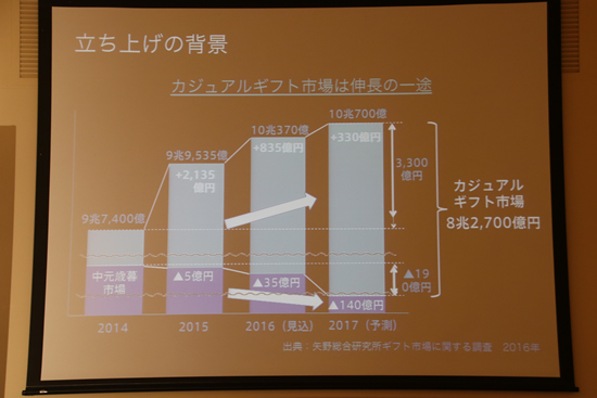 金田正人代表取締役社長は、ECサイトをオープンする背景について「2016年に矢野総合研究所が実施したギフト市場に関する調査によると、14年の調査開始から16年にかけてカジュアルギフト市場は約3000億円の成長を見込んでおり、さらに成長を続けると予測されている」と前置きし、「レッドホースプルート独自の調査では、誰かにあげる『ちょっとしたプレゼント』を送る際に困った人は8割以上に達し、送った際の金額の約7割が3000円以下だった」と説明。「PRELYは、こういった層をターゲットに事業を展開する」と述べた。