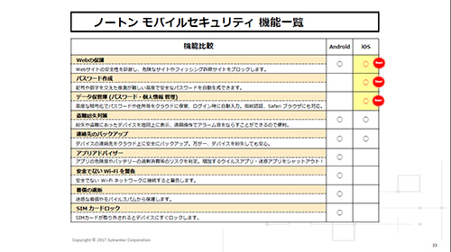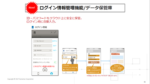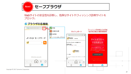 1部の調査結果を踏まえて、発表したのがiOSモバイル端末向けのパスワード・個人情報管理機能を大幅に強化した「ノートン モバイルセキュリティ」の最新版だ。iPhone/iPadのシェアが高い日本市場の特性を考慮し、世界に先駆けて先行リリースする。特徴は「データ保管庫」「セーフブラウザ」「パスワード作成機能」の三つの新機能だ。
