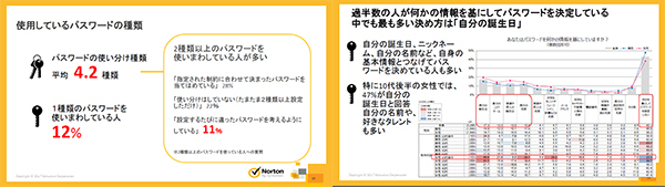 「使用しているパスワード種類数」では平均で4.2種類という数値が出た。想像していたより高く感じたが、一方で1種類のパスワードを使い回している回答も12%を占めた。「パスワードの種類が多いのはもちろん、どんな情報にもとづくかも非常に重要。アンケートでは“誕生日”が、性別・年代問わず高い割合を占めた」と古谷部長はパスワード設定の傾向を説明する。