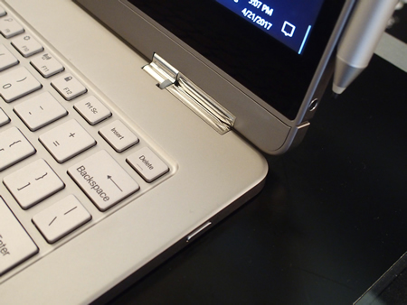 ディスプレイ部と本体部をつなぐヒンジは、光沢のある「ギア」を採用。ステンレス製で車のギアの形状を模したという。このヒンジで360°の回転を可能にする。電動式でディスプレイ部のロック操作を行う「オートラッチメカニズム」も搭載した。