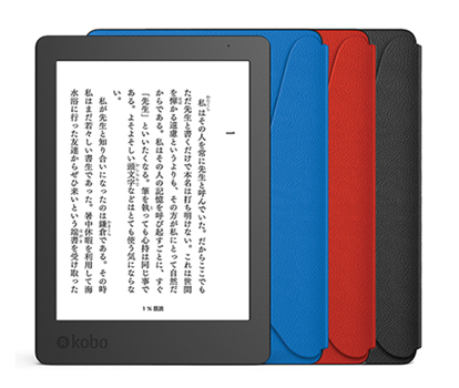 「Kobo Aura Edition 2」は、6インチのCarta E Inkタッチスクリーンを採用したポケットサイズの小型軽量モデル。内蔵メモリの容量は4GB、重さは約180g。税別価格は1万2800円。「Kobo Aura H2O Edition 2」用はブラック、「Kobo Aura Edition 2」用はブラック/レッド/ブルーの3色のカラーバリエーションを揃える別売りの専用ブックカバーは、それぞれ3480円。