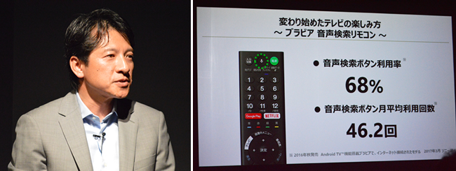 15年5月発売機種からAndroid TVを標準搭載しているが、ソニーの調査によると「16年秋発売のAndroid TV機能搭載ブラビアでインターネット接続されたモデル」の音声検索ボタン利用率は約68%、月平均利用回数は46.2回だった。ソニーマーケティングの河野弘社長は「インターネット配信のコンテンツを楽しむ人が増え、新しいテレビのスタイルが徐々に受容されつつある」と語る。