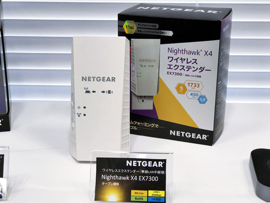 同時発売のNighthawk X4 EX7300は、電源コンセントに直接差し込む形態の中継器で、無線LANルータ1台だけでは電波が届きにくい場所の通信速度や安定性を改善する。5GHz帯で最大1733Mbps、2.4GHz帯で最大450Mbpsの通信が可能。