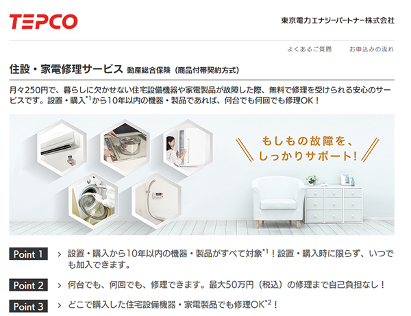「住宅設備・家電修理サービス」は、電気・ガス式を問わず、調理コンロや給湯器などの住宅設備機器や、家電製品(エアコン、冷蔵庫、洗濯機)が自然故障した際に、1回あたり最大税込50万円まで、何台・何回でも、自己負担なしで修理が受けられるサービス。対象は、設置・購入から10年以内の対象機器・製品すべて。電気料金プラン「スマートライフプラン」に無料で付帯している「住宅設備修理サービス」と同内容で、東京電力との電気の契約の有無に関係なく、加入できる。