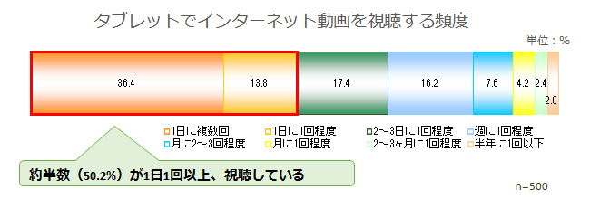 BCNが5月にインターネット上で実施した「タブレット動画視聴ユーザー調査」によると、タブレットで動画を視聴している20代~60代の男女500名のうち、約半数が「1日1回以上、動画を視聴している」と回答。「1日に複数回」というヘビーユーザーも36.4%に達した。