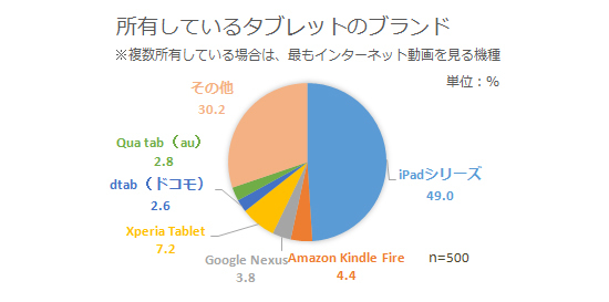 所有しているタブレットの機種は、AppleのiPadシリーズが最も多く、約半数を占めた。残りは、ドコモの「dtab」、auの「Qua tab」など、キャリアモデルを含む、国内外のメーカーのAndroidタブレット。
