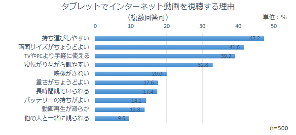 また、タブレットでインターネット動画を視聴している全員に、その理由を聞くと、「持ち運びしやすい」「画面サイズがちょうどいい」「TVやPCより手軽に使える」といった回答が上位に入った。動画視聴に関しては、スマホより、8インチや10インチなど、大きな画面のタブレットのほうがアドバンテージがあるといえるだろう。